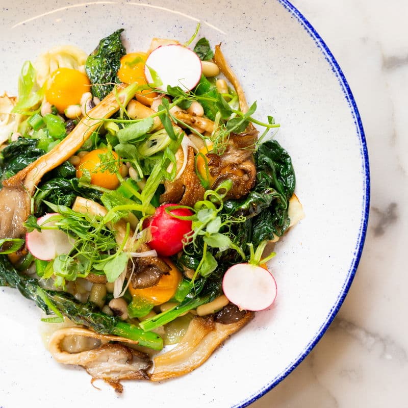 Flageoletbonen in dashi met kai lan met miso dressing, spitskool, oesterzwam en gerookte eidooier creme