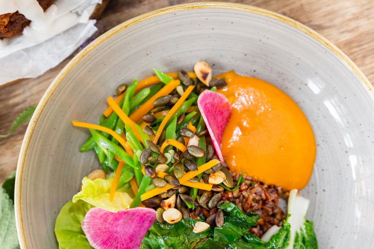Rode rijst met tomatillos-paprika-prei creme, paksoi, red meat radijs, snijboon en cashew